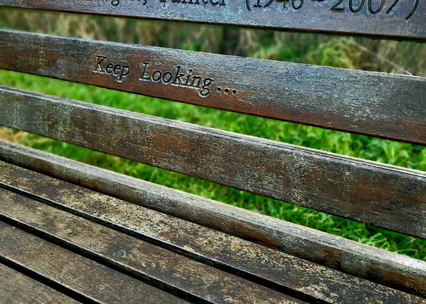 Leaving you in 2021 with a photograph of Peter's bench in Dinorwic reminding all who sit, looking out towards the Wicklow Hills, to 'Keep Looking'.